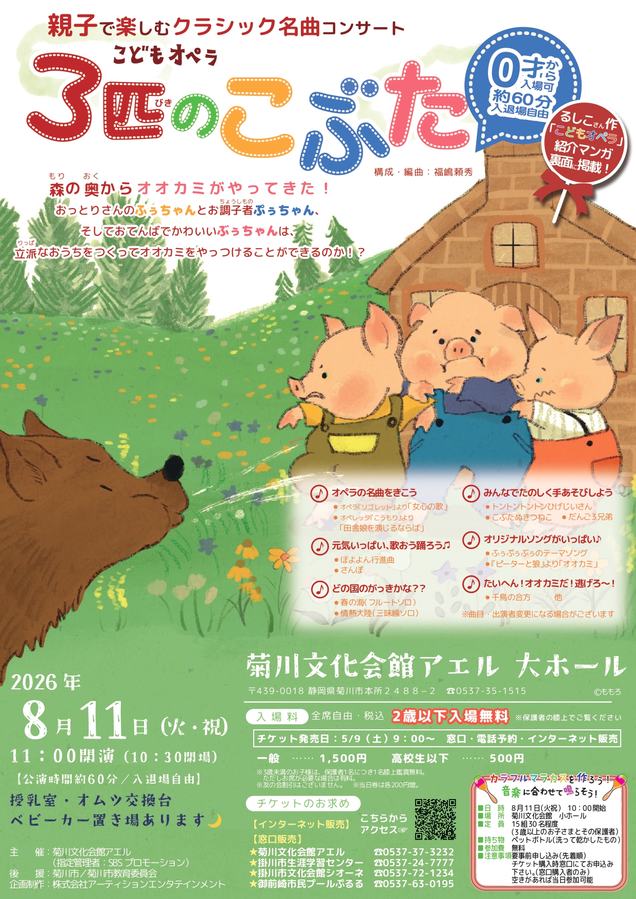 館内点検に伴い、2026年5月3日(日)・4日(月・祝)菊川文化会館アエルの営業時間が変更となりますのでお知らせいたします。