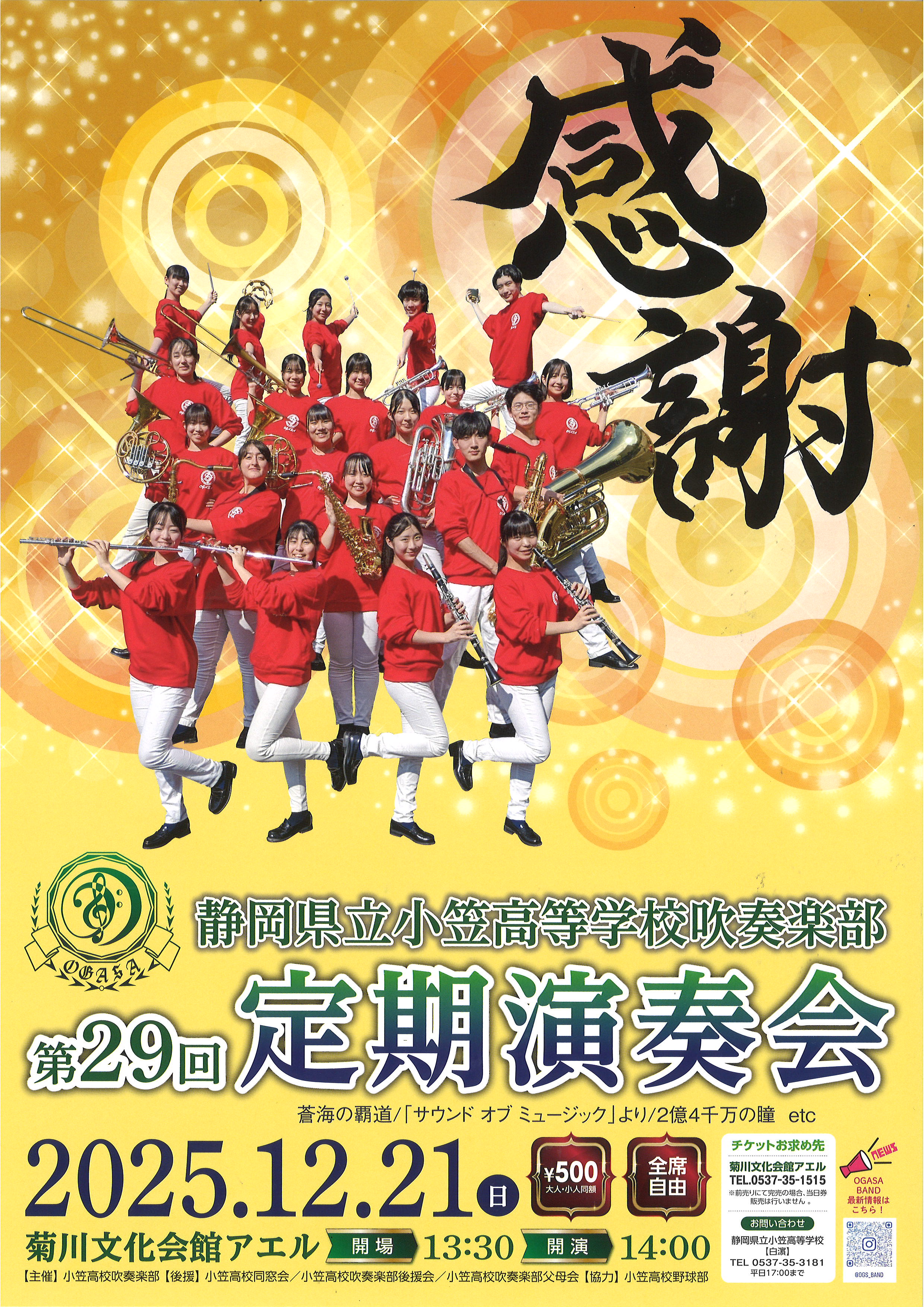 小笠高校吹奏楽部 第29回 定期演奏会 12/21(日) 会場大ホール時間開場13:30/開演14:00料金自由席500円チケット販売アエルでチケット販売中!お問合せ静岡県立小笠高等学校 吹奏楽部 ℡0537-35-3181 < イベント情報 一覧