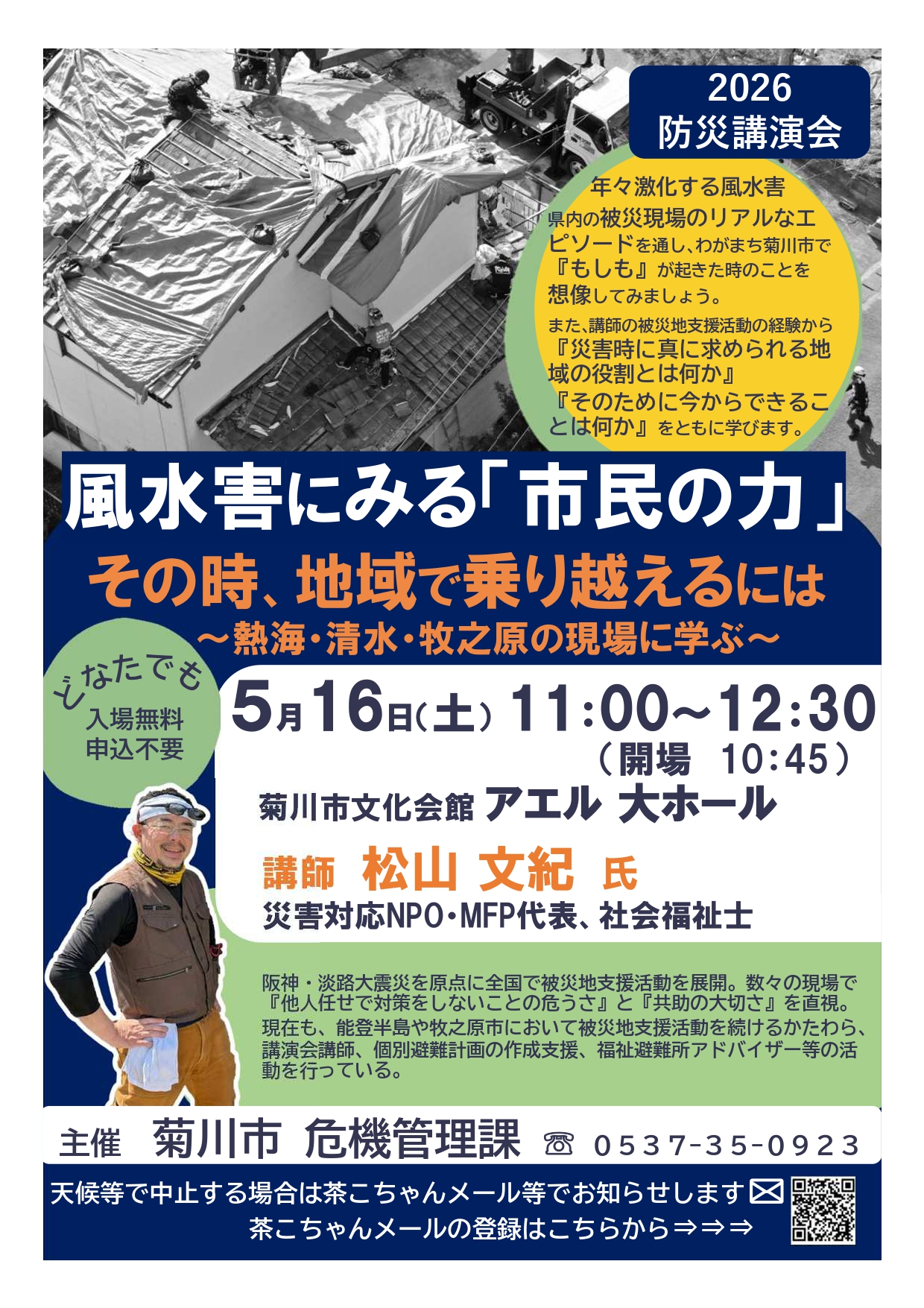 2026 菊川市防災講演会 講師:松山文紀 氏 5/16(土) 会場大ホール時間開場10:45/11:00~12:30入場方法無料 申込不要お問合せ菊川市役所 危機管理課 ℡0537-35-0923 < イベント情報 一覧